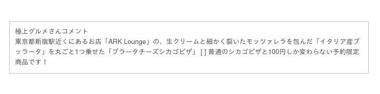 ブラータチーズのシカゴピザを食べれるのは?▶『Ark Lounge 新宿西口店』