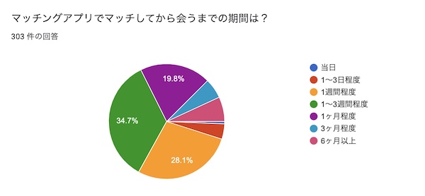 マッチングしてから出会うまでの期間を調査したところ、1~3週間が34.7%で最多、次いで1週間程度が28.1%、1ヶ月程度が19.8%となりました。