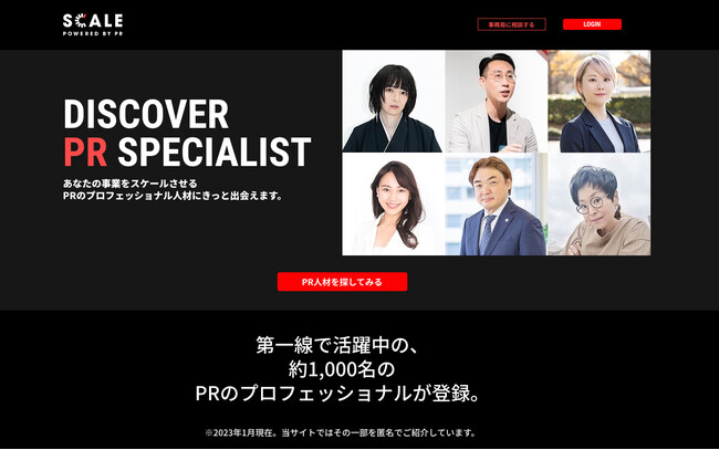 SCALEの人材プラットフォームにご登録いただいているPRパーソン約1,000名の中から、特に実績豊富な方やご活躍著しい登録者様を厳選し、匿名で掲載。PR人材をお探しの企業様は、法人アカウントでログインいただくことで詳細プロフィールを閲覧でき、協業を依頼したいPR人材をご指名の上、SCALE事務局にご相談いただけます。