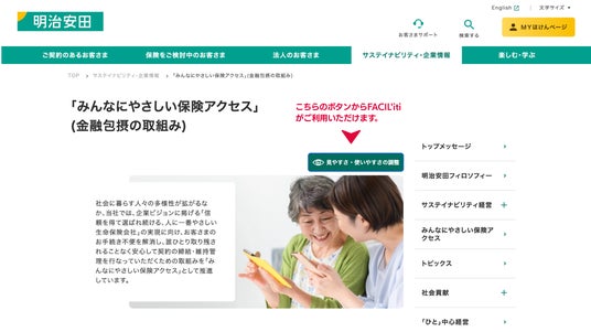 フランス発のデジタルインクルージョンのためのソリューション「FACIL’iti(ファシリティ)」(以下、FACIL’iti)が、明治安田生命保険相互会社(以下、明治安田)の公式ウェブサイトに導入されました。