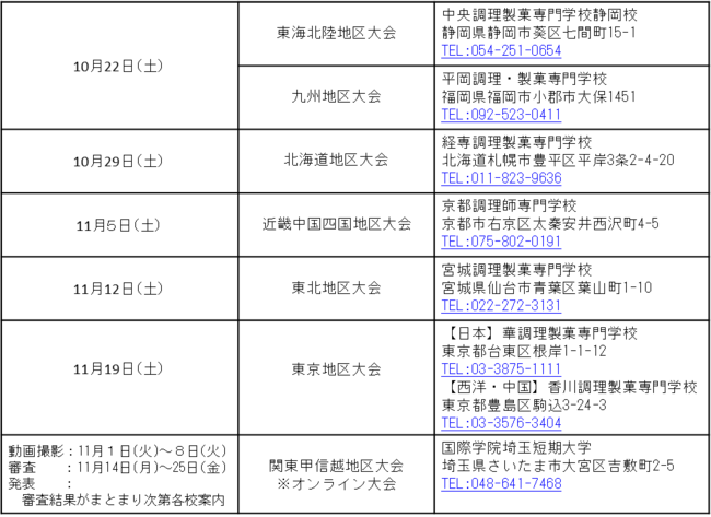 公益社団法人 全国調理師養成施設協会(会長:服部幸應、所在地:東京都渋谷区) は、2023年2月に行われる「第38回調理師養成施設調理技術コンクール」全国大会(決勝)への出場をかけた地区大会(予選)を全国各地区で10月22日~11月19日に開催します。