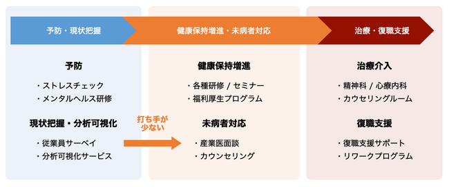しかし、メンタルの現状把握するサービスは増えたものの、高ストレス判定者が出現した際などの対応・解決策がカウンセリングや産業医面談といった対人での限られた方法しかないのが現状です。対人による支援では、人的資源問題や面談を受ける側の抵抗感など、等しく全ての不調な人に対人支援を提供することが困難であるという課題があります。