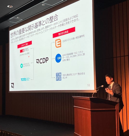 CDP ディスクロージャー APAC ヘッドの原田 卓哉氏からは、開発が進む 2026 年の質問書等について説明されました。新しい環境課題として「海洋」が追加されることや、「水セキュリティ」では排水の処理が「規制を遵守した処理レベルであるか」の報告を求めるようになることなどが紹介されました。