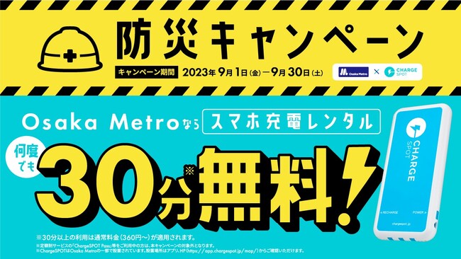 モバイルバッテリーシェアリング「ChargeSPOT」を展開する、株式会社INFORICH(本社:東京都渋谷区、代表取締役社長:秋山 広宣、以下INFORICH)と、大阪市高速電気軌道株式会社(本社:大阪市西区、代表取締役社長:河井 英明、以下Osaka Metro)は、2023年9月1日(金)から9月30日(土)まで、Osaka Metroの駅に設置のChargeSPOTが30分未満なら何度でも無料で利用できる防災キャンペーンを実施します。
