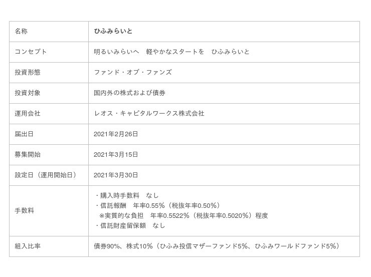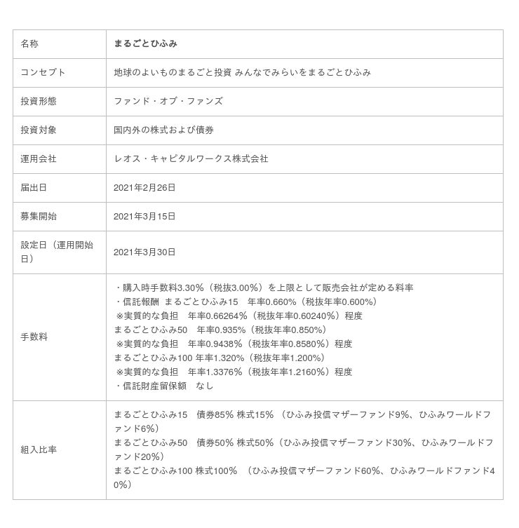 投資信託「ひふみ」シリーズを運用するレオス・キャピタルワークス株式会社(本社:東京都千代田区、代表取締役会長兼社長:藤野 英人、以下当社)は、2021年3月30日に国内外の株式および債券を投資対象としたアクティブ運用の公募投資信託「ひふみらいと」「まるごとひふみ」(まるごとひふみ15、まるごとひふみ50、まるごとひふみ100の総称。以下同じ)の運用を開始いたしました。