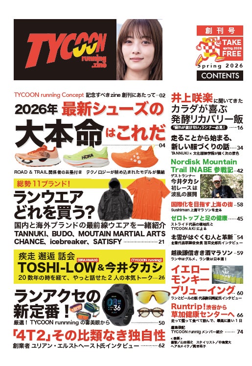 創刊号の表紙は、井上咲楽さんが登場。各メーカー担当者によるリコメンド付きの最新シューズ情報から、TYCOONがおすすめするランニングアクセなどの特集記事も充実している。