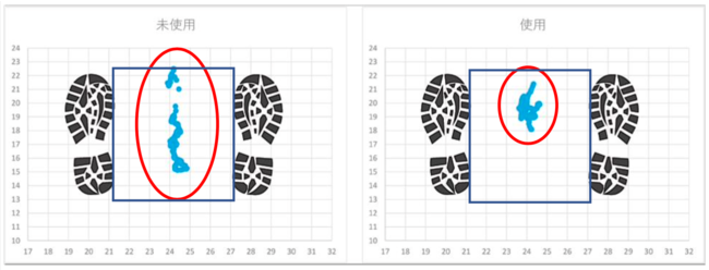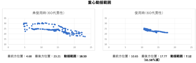 重心動揺範囲が最大63.15%減少、平均で52.95%の減少となり、明確な重心安定効果が計測された。
