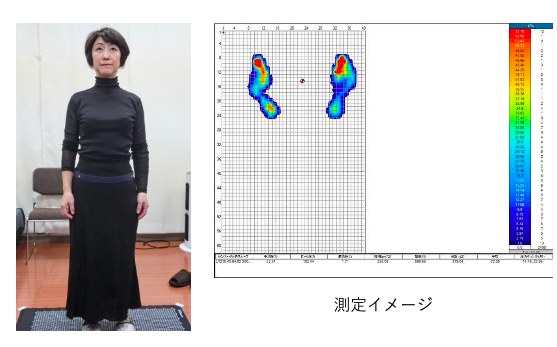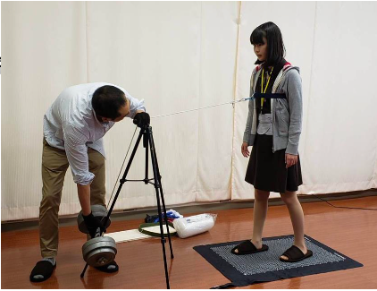 歩行時を模して足を前後に開き、胸に巻いたベルトにロープを結び、前方向に20キロの加重し重心を計測。その際、スパオールシートとダミーシートを計測器の下に敷いて比較。