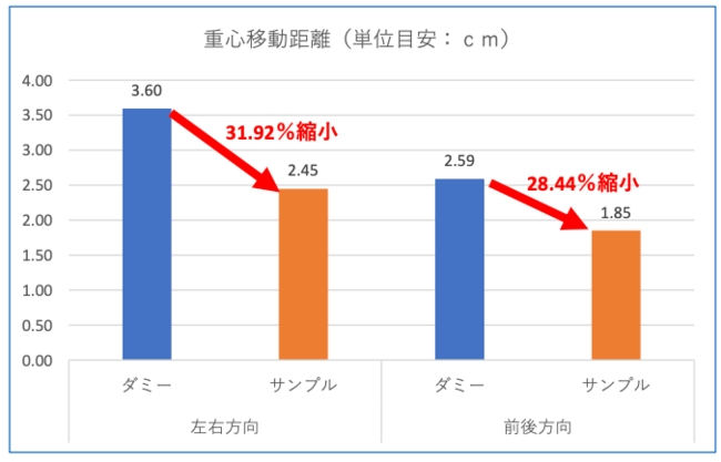重心動揺の範囲が縮小値は、左右方向に31.92%、前後方向に28.44%の縮小値を示した。