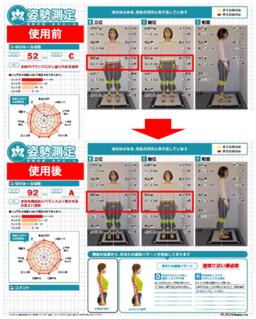 スパオールの使用前、使用後の姿勢データです。 体幹に大きく影響する骨盤の傾きがリセットされたという結果が示されました。