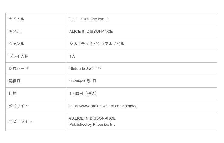 株式会社Phoenixx(東京都千代田区、代表取締役社長:坂本 和則)は、2020年12月3日に発売を予定しております『fault - milestone two 上』Nintendo Switch™版のあらかじめダウンロードを、本日2020年11月26日より開始したことをお知らせいたします。