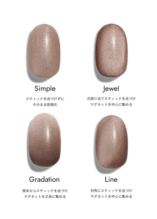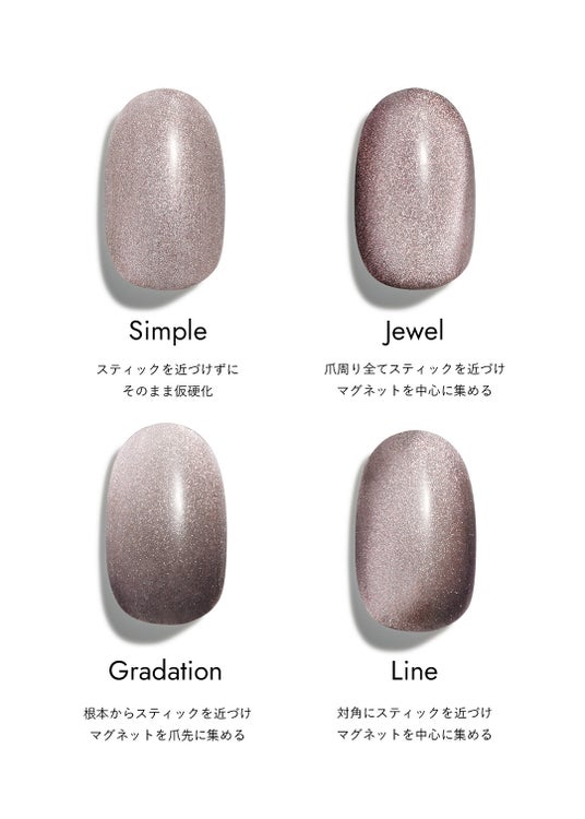 一般的なマグネットパウダーより粒子の細かい*最高級の超微細マグネットパウダーを使用することで、派手になりやすいマグネットカラーを上品に仕上げています。