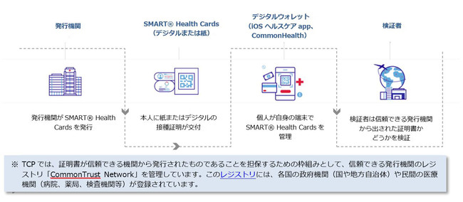 SMART(R) Health Cardsはワクチン接種履歴や検査結果などの健康情報をデジタル記録するための国際規格で、TCPのほかApple、Microsoft、全米病院ランキング1位のメイヨークリニックなどテクノロジーと医療の分野をリードする組織がステアリングを務める官民連合「Vaccination Credential Initiative」が中心となって推進しています。