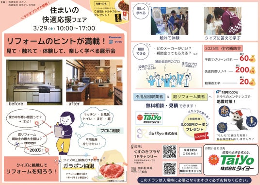 株式会社タイヨーは3月29日(土)、くすのきプラザ(安芸郡府中町本町)で開催されるリフォーム展示会「住まいの快適応援フェア」にて、不用品処分のための無料相談・見積もりを実施します。