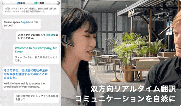 自社開発の双方向同時通訳機能により、まるで同郷の友人と話しているかのようなスムーズな会話が可能です。お互いに1つずつイヤホンを装着するだけで、言語が異なる外国の方とも母国語で会話ができます。翻訳された言葉がイヤホンに直接届き、自然なコミュニケーションを楽しめます。