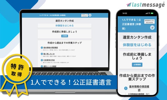 当社は、より簡単かつ確実に遺言書をのこす方法を提供することを目的に、遺言書の作成・管理をサポートする「lastmessage」サービスを開発してまいりました。この特許の取得により、当社のサービスは独自性を有し、画期的なものとしてご利用いただけることとなりました。