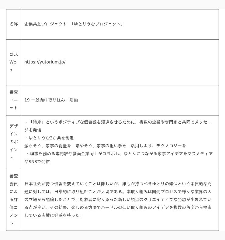 ゆとりうむプロジェクトは、2019年にはじまって以来、多数の企業・団体の協力のもと、共働きなどで忙しい人々の生活に「時間を産み出す」というコンセプトでさまざまなイベントや調査を行ってまいりました。このたび、活動が評価されグッドデザイン賞をいただけるということで、これまでの取り組みが評価されたことを嬉しく思います。同時に、これから活動をさらに広げて定着させていかなければ、と感じております。