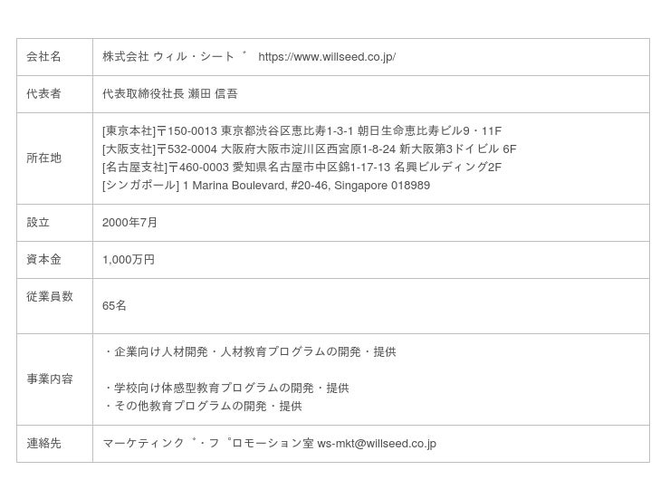 「未来へ意志の種をまく(will・seed)」を社名とするウィル・シードは、1人ひとりが自分らしく挑み・学び・変化する場づくりを通じて、その先にある、社会を変える価値の創出を目指しています。2000年に子ども向け体感型教育で創業後、企業での階層別教育や次々世代・次世代リーダー育成、グローバル人材育成事業を展開。コロナ禍で社会や生活、働き方が大きく変化する今、「100の言葉より、ひとつの体験を。」をスローガンに掲げ、未来をつくる学び体験の提供に取り組んでいます。