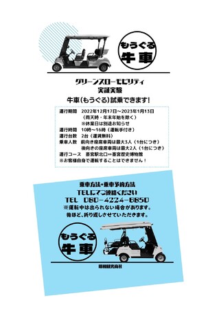 一般社団法人明和観光商社(代表理事:千田良仁)は、グリーンスローモビリティの牛車(もうぐる)を使った実証実験のための運行を2022年12月17日(土)から開始します。実証実験として、グリーンスローモビリティ「牛車(もうぐる)」を使って、史跡斎宮跡と斎宮歴史博物館を繋ぐルートを考案し、新しい国史跡斎宮跡と斎宮歴史博物館の楽しみ方を提案します。