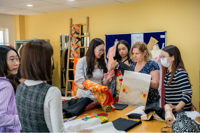 同社では、独自の反物製造だけではなく専属デザイナーによる各国へのお針子技術指導を行っております。貧困層の方には技術を身につけることで手に職をつけていただき自立をしていただけるようサポートしております。服飾学生には、日本の伝統衣装である着物の知識やデザイン講義を行い、着物の特徴を活かしたものづくりを指導し未来のデザイナー育成を支援しています。