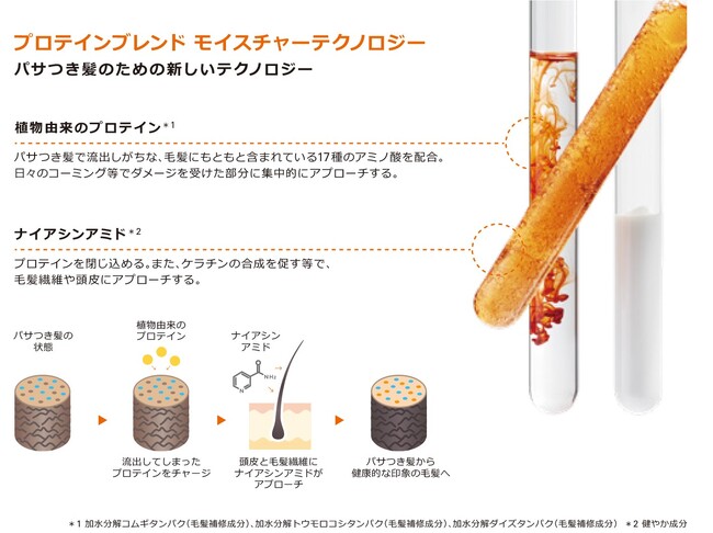 *1 加水分解コムギタンパク(毛髪補修成分)、加水分解トウモロコシタンパク(毛髪補修成分)、加水分解ダイズタンパク(毛髪補修成分) *² 健やか成分
