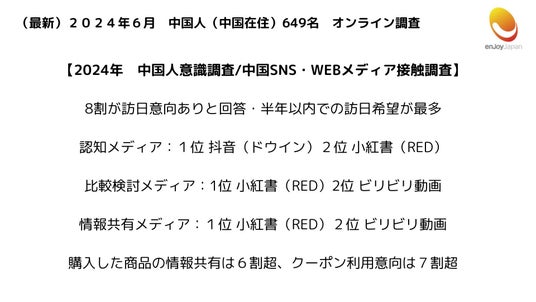 訪日インバウンドマーケティング支援を行う株式会社ENJOY JAPAN(所在地:東京都新宿区、代表取締役社長 瞿 史偉、以下「ENJOY JAPAN」)は、中国在住の中国人に対して、WEBアンケート調査(有効回答数:649名、実施日:2024年6月24日から30日まで、対象エリア:一線・新一線線都市、対象年齢:20~49歳)を実施いたしました。