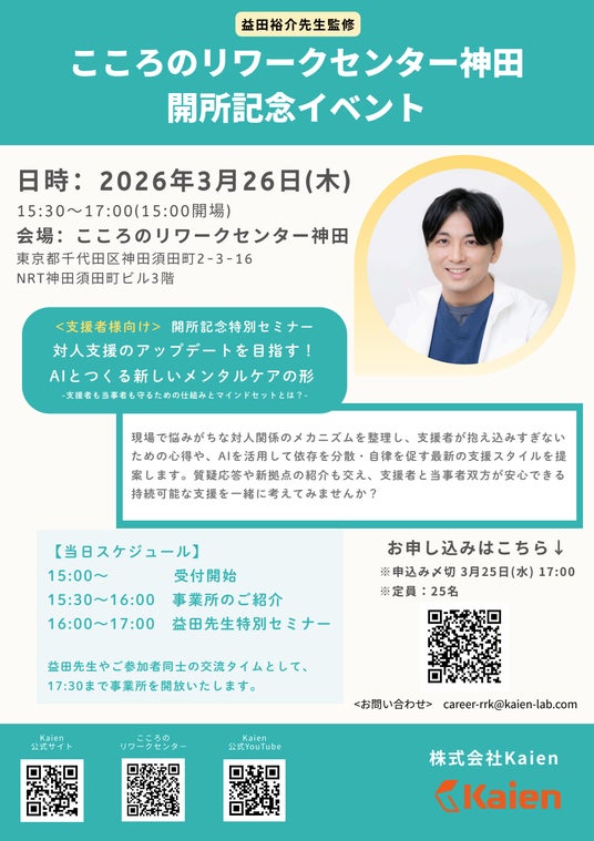 株式会社Kaien(本社:東京都千代田区、代表取締役:鈴木慶太、以下「Kaien」)は、2026年4月、精神科医・益田裕介先生監修のもと、新たな就労移行支援事業所「こころのリワークセンター神田」を東京都千代田区に開所いたします。
