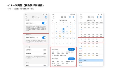「残業申請機能」「36協定(残業上限管理)機能」「複数回打刻機能」を追加