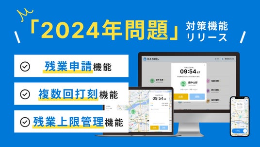 2024年4月1日より、建設業、トラック・バス・タクシードライバー、医師の「働き方改革」を進めるため、時間外労働の上限規制が適用となります。そして昨今、それによって生じる様々な問題が「2024年問題」と呼称されています。物流・運送などの業界は特に対応が求められ、企業は新たな労働時間管理の方法を模索する必要に迫られています。この社会的背景を踏まえ、当社開発の勤怠管理アプリ「カンリル」では、勤怠管理者が従業員の不規則な勤怠状況を容易に把握できるよう、「残業申請機能」を追加しました。また、3月には「36協定(残業上限管理)機能」と「複数回打刻機能」を追加予定です。
