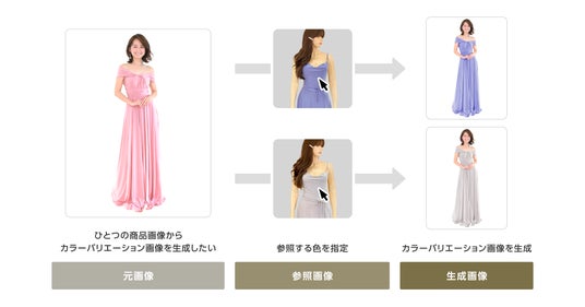 生体認証や画像認識サービスを展開する株式会社ELEMENTS(本社:東京都中央区、代表取締役社長:長谷川 敬起、以下「ELEMENTS」)は、この度、画像生成AIツール「SugeKae(スゲカエ)」をブライズメイドドレス専門店のエクラ株式会社(本社:東京都港区、代表取締役社長:浅原 怜、以下「エクラ」)に提供し、本格運用を開始したことをお知らせします。エクラでは、これまで工数の問題で数パターンの撮影のみとなっていたカラーバリエーション(以下、カラバリ)の画像を50色以上に拡大できるようになります。色の追加に必要なサンプル手配・撮影費用を1色あたり200円(税抜)/枚程度に抑え、撮影コストや工数の大幅な削減を実現しています。また、「SugeKae」に新たに実装されたカラバリエンジンの適用により、より高品質なカラバリ画像の生成ができ、顧客への多彩なカラー提案につなげます。これにより、販売促進や顧客満足度の向上が期待されます。