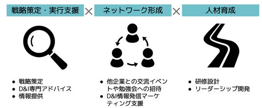 D&Iを推進する組織の伴走パートナーとして、調査分析~戦略策定~実行支援まで幅広く提供します。組織でD&Iを実現するには唯一絶対の解はありません。