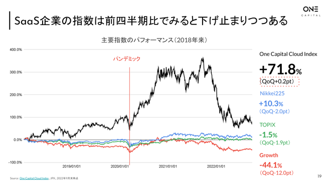 米金利上昇の影響を受け、SaaSをはじめとする成長企業の株価は大幅に下落しました。しかし前四半期と比較すると、グロース指数は12pt下落しているのに対し、SaaS上場企業29社で構成される「One Capital Cloud Index」は下げ止まりつつあることがわかります(前四半期比0.2pt増)。