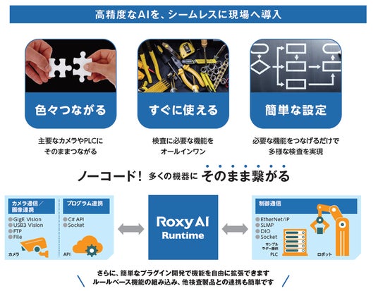 また、「Roxy AI」ランタイムライセンスにより、ノーコードで主要なカメラやPLCなどとの機器連携が可能となり、短期間・低コストで検査システムを導入できます。
