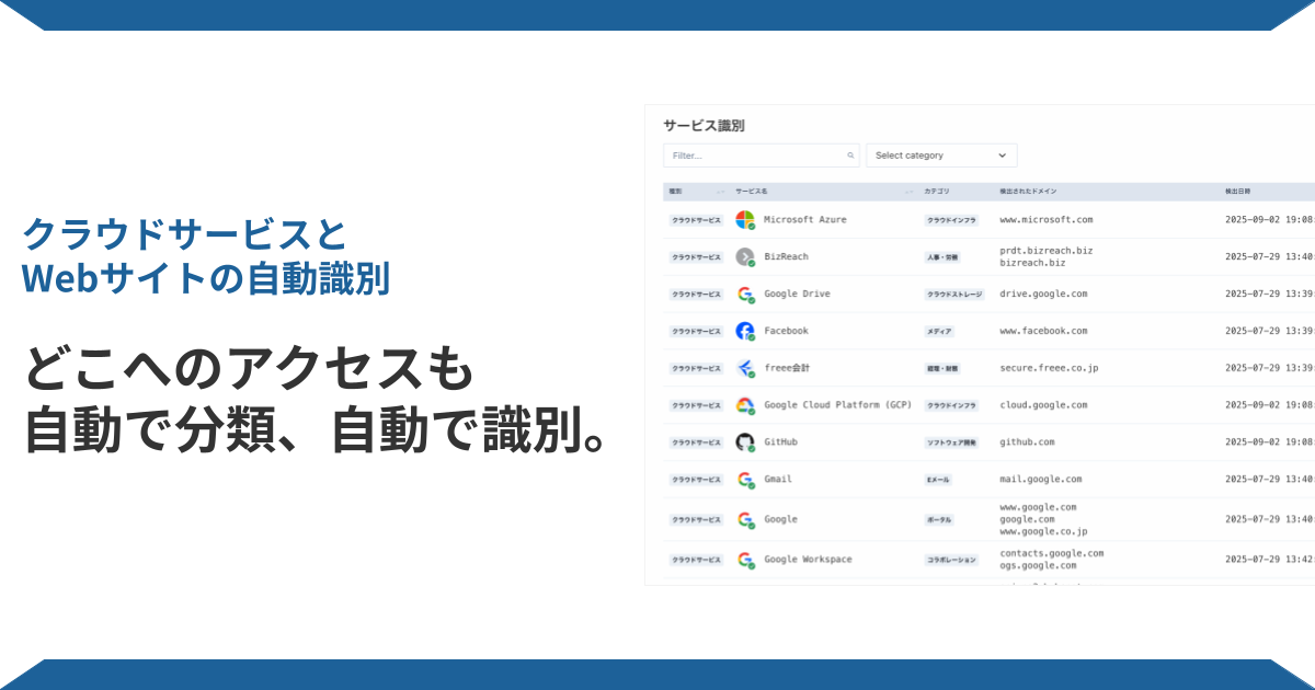 未知のクラウドサービスもAIが自動識別。国産SaaSを含むシャドーITを網羅的に可視化し、企業のデータ漏洩リスクを抜本的に低減