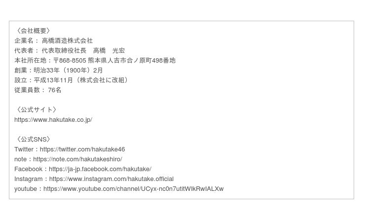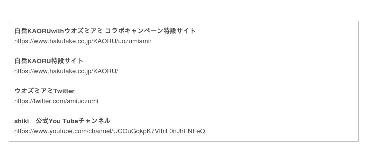 また、楽曲は熊本の音楽シーンで最注目の若手アーティストShiki(シキ)が制作。3つのストーリーのイメージに合わせて曲と詩を書き下ろした完全オリジナルソングです。本キャンペーン動画については、特設サイト(https://www.hakutake.co.jp/KAORU/uozumiami/)内でご覧いただけます。