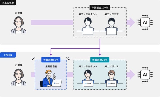 AIコンサルタントの高コストが課題となる中、LYZONでは「業務担当者」が一部の作業を担うことで、低コストでのサービス提供を実現しています。