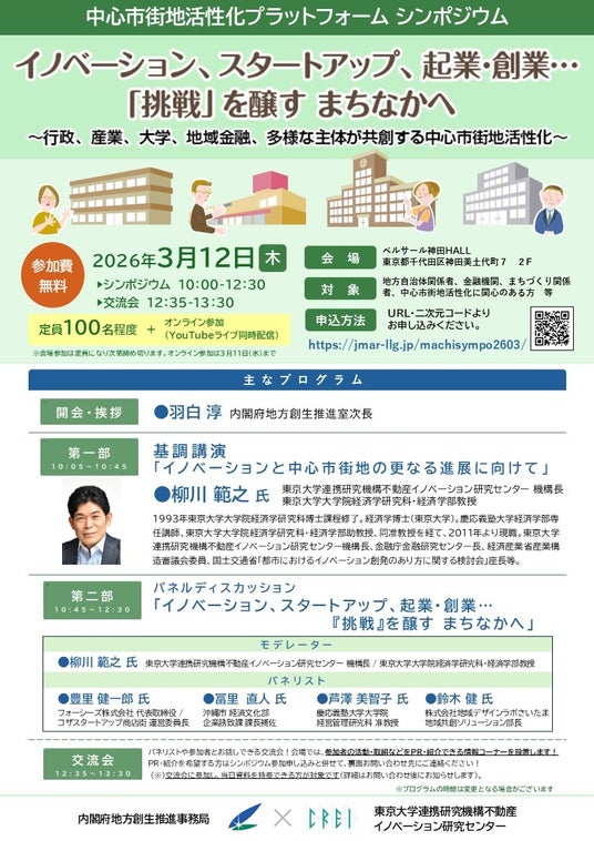 当日は、東京大学連携研究機構不動産イノベーション研究センターの機構長を務める柳川 範之氏から「イノベーションと中心市街地の更なる進展に向けて」と題して、基調講演をいただきます。その後、産・官・学・金の多様な主体に登壇いただき、それぞれの立場からまちなかでのイノベーション等に関する事例発表と理論と実践の視点から「イノベーション、スタートアップ、起業・創業…『挑戦』を醸すまちなか」についてパネルディスカッションを行います。