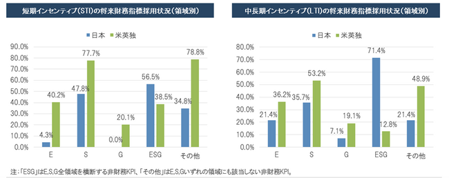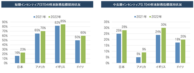 非財務指標(将来財務指標)を採用する日本企業の割合は、STIで23%、LTIで28%であり、前年から増加している。海外企業はSTIで将来財務指標を採用する傾向がある一方、日本企業はLTIで将来財務指標を採用する傾向がある