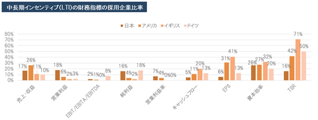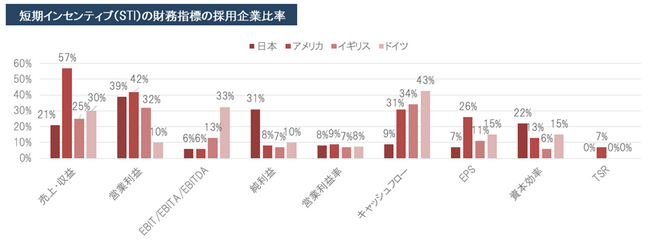 業績連動報酬において採用される財務指標について、短期インセンティブ(STI)では営業利益や純利益を採用する日本企業が多い傾向がみられた。LTIにおいては、資本効率や営業利益を採用する日本企業が多く、欧米企業との比較では、1株当たり利益(EPS)、株主総利回り(TSR)の採用企業が圧倒的に少なかった