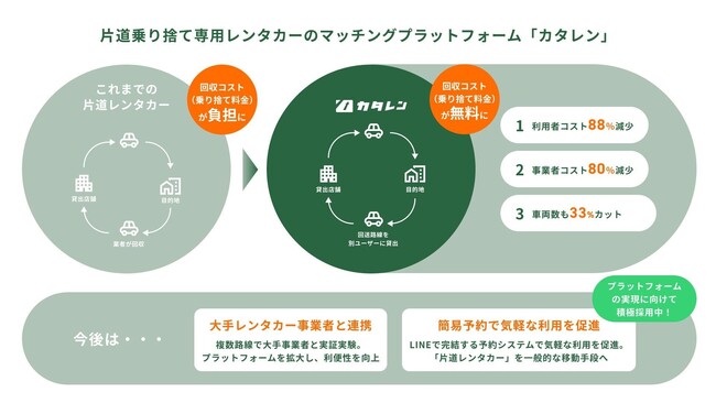 「カタレン」は、レンタカーのアウトレットモールのように、多数のレンタカー・カーシェア事業者様と提携し、回送車両やレンタカーの上り片道利用ユーザーと下り片道利用ユーザーをマッチングさせる「片道乗り捨て専用レンタカーのマッチングプラットフォーム」です。本来レンタカーとして利用されない車両を活用するため、事業者は回送コストを抑えるだけでなく収益に変えることが可能となります。また一般のレンタカー事業者であれば、必要な車両数も削減可能です。