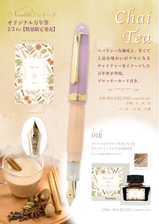 文具卸・店舗運営の株式会社エヌ・ビー・シー(本社東京都目黒区 / 代表取締役社長 丸山裕子、以下エヌ・ビー・シー)のオリジナルブランドNONBLEから、『紅茶』をテーマにした万年筆&インク第三弾が数量限定で登場。今作はチャイティーをイメージした色合いになっています。2月2日(金)より、エヌ・ビー・シーの展開する全国10店舗と、オンラインストアにて発売いたします。