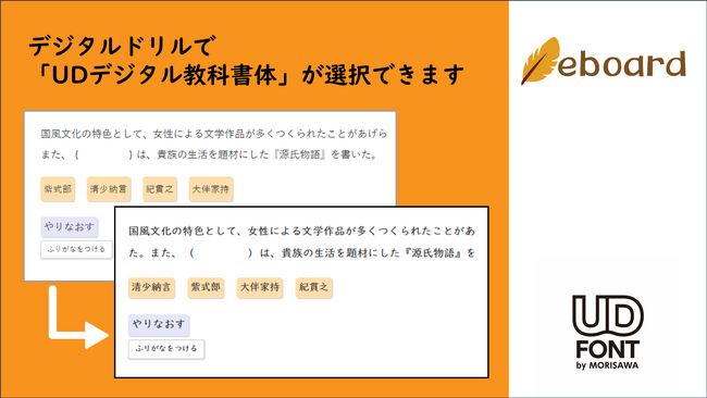 このたびNPO法人eboardは、株式会社モリサワのWebフォントサービス「TypeSquare」を導入し、ICT教材eboardのデジタルドリルの問題文、解説文などが、「UDデジタル教科書体」で表示できるようになりました。書体の選択肢を増やすことにより、読みに困難を抱える子などが、学習に取り組みやすくなることがあります。