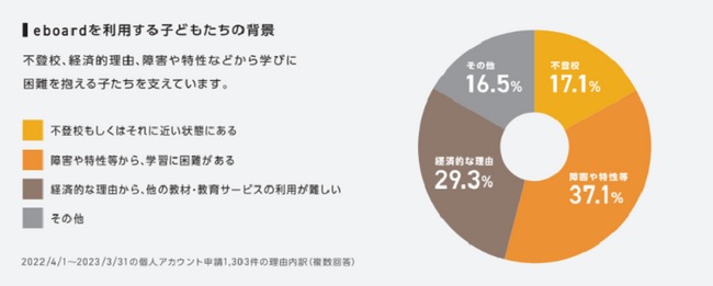 映像授業とデジタルドリルで個々に応じた学習をサポートするICT教材eboardは、公立学校および個人は無償で利用することができ、全国11,000校以上の教育現場で毎月20~30万人が利用しています。利用者の中には障害や特性等から学習に困難がある子も多く、2022年度の個人アカウント申請のうち、37.1%が「障害や特性等から、学習に困難がある」という理由でした。これは、アカウントを申請する理由の中では最も高い割合を占めました。