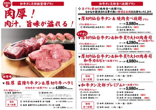 ファステストダイニング株式会社(本社:滋賀県湖南市、代表取締役:谷口 譲)は「神戸三宮 和牛タン次郎」限定で『極厚 霜降り牛タン&厚切り牛ハラミ付き焼肉食べ放題プラン』を販売開始いたします。