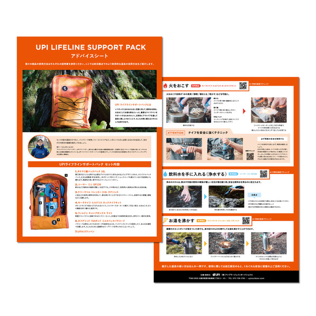 「UPI ライフラインサポートパック」はいつやってくるかわからない災害に対して、「飲料水を得る」「火をおこしてお湯を得る」といった、重要なライフラインをサポートするためのアウトドアアイテム道具を取りまとめたセットです。日常的にアウトドアを通して道具に親しんでおくことで、もしもの時に備えるスキルとして応用できます。