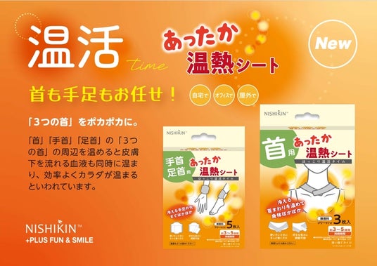 美容と健康を提供する商品企画・販売を行う錦尚金株式会社(本社:東京都中央区銀座3-15-8 代表取締役社長:宋莉莉)は、身体の三首である「手首・足首・首元」を温め、効率的に身体の内側からポカポカになるための「あったか温熱シート」シリーズ2商品を新発売。