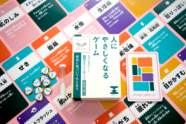 「人にやさしくなるゲーム」は、薬局・ドラッグストアで展開する漢方薬ブランド『漢方セラピー』シリーズの誕生15周年を記念し、誰もが“自分らしい”生き方をできる社会になってほしい、という想いを込めて、クラシエ薬品として初めて企画・開発したカードゲームです。これまであまりコミュニケーションの対象とされてこなかった身体の「症状」や「お悩み」について考える内容となっています。