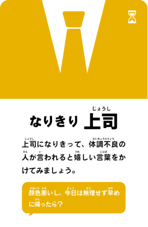 「まわりの人」は、9種類のアプローチカードに基づいた方法で「体調不良の人」へ【セラピーワード】をかけます。アプローチカードには、「体験/共感」や「オノマトペ」「気遣い」などのほかに、上司や子供、恋人になりきって声をかける「なりきり」カードもあるため、様々なアプローチで声をかけてみましょう。ただし、【セラピーワード】をかけるとき、症状名が含まれる単語は使用できないので注意が必要です。