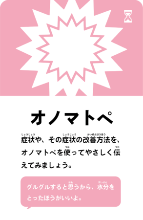 「まわりの人」は、「体調不良の人」の症状を、ガンガンやグルグルなどのオノマトペを使ってやさしく伝えてみましょう。同じ症状でも、人それぞれ感じ方が違ったりします。思い切って、自分なりに伝えてみることが、ヒントになることもあります。