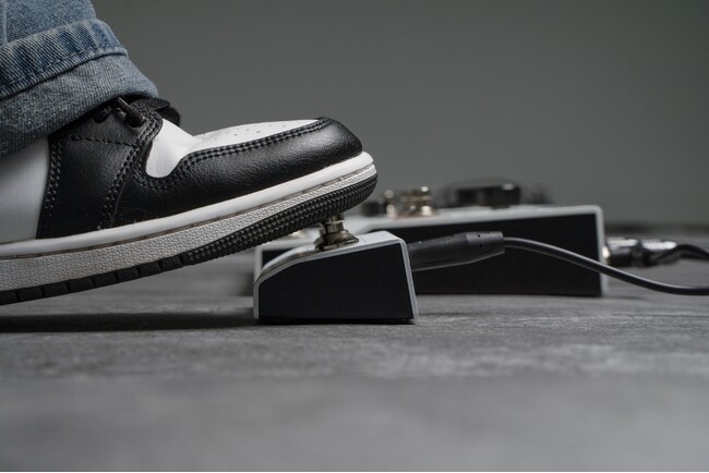 6.35mm TRS ケーブル(パッケージに付属)を使用して、 AMPERO SWITCH + をAMPERO シリーズの外部ペダル / フットスイッチインターフェイスに接続し、AMPERO シリーズエフェクトのグローバル設定で外部ペダルインターフェイスタイプを「dual footswitch/デュアルフットスイッチ」に設定すると、必要に応じてAMPERO SWITCH + の 2 つのフットスイッチに異なる機能を割り当てることができます。